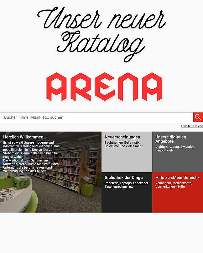 Sie finden alle Informationen rund um die Mediothek und unseren Bibliothekskatalog (Arena) unter folgendem Link: https://katalog.gym-muttenz.ch/